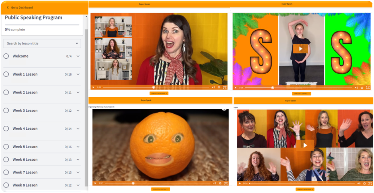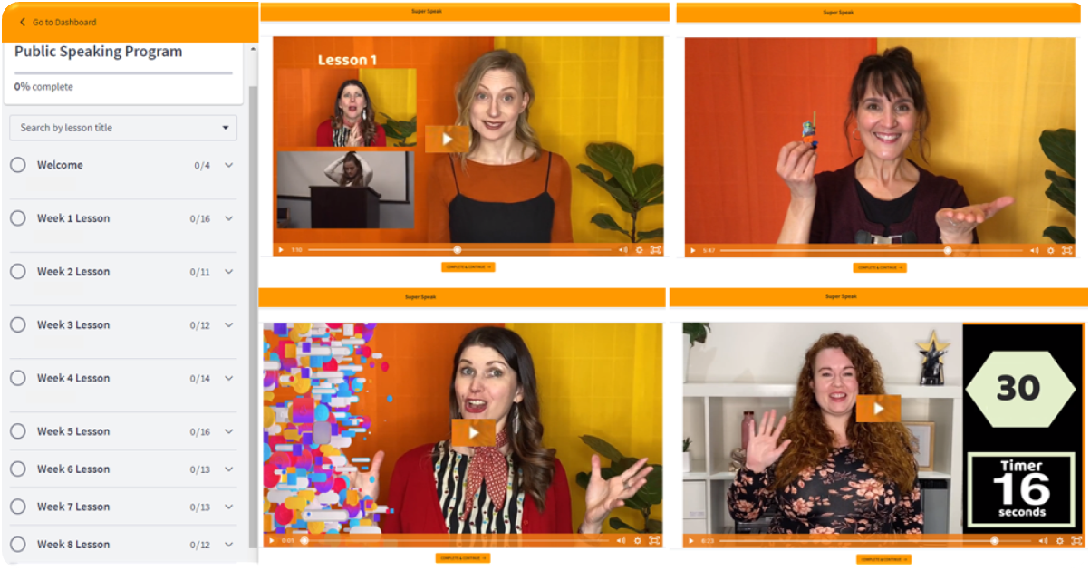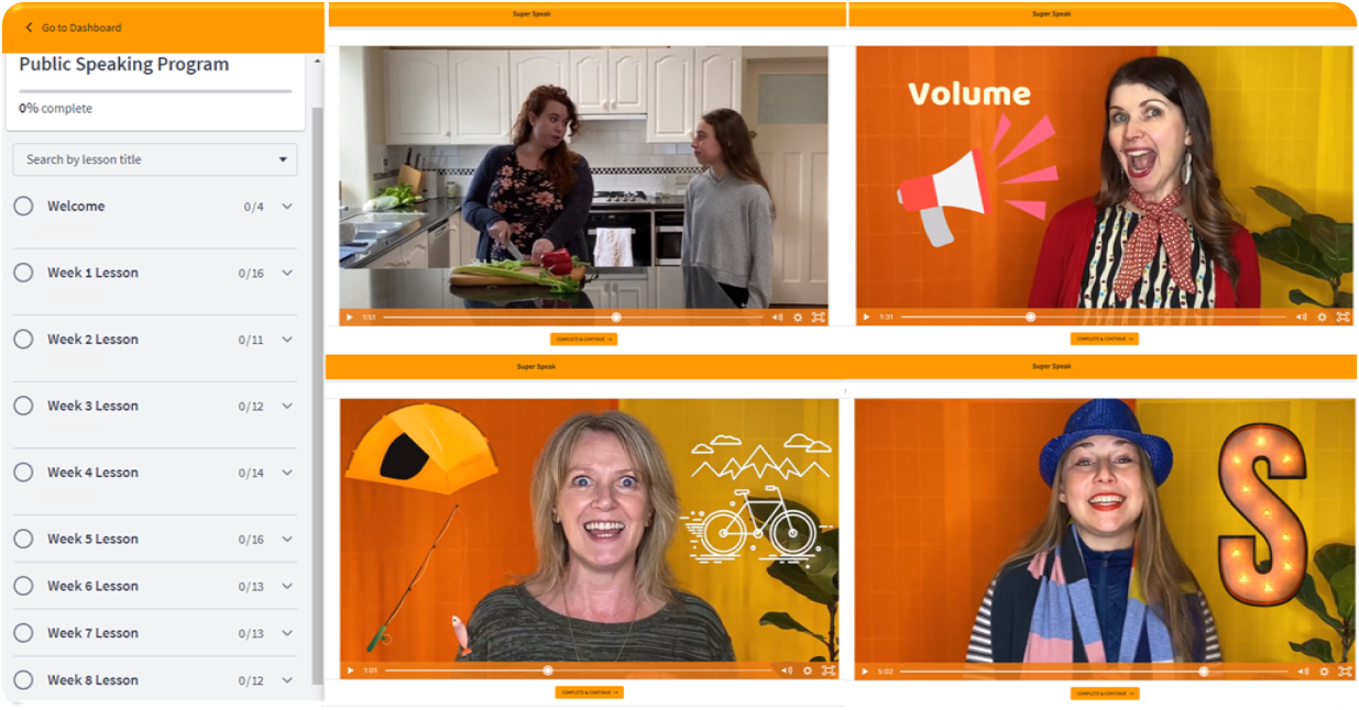 Our student's learn & prepare during the 8 x "on-demand" lessons (more info below), practice from home, and present live in a private 1-on-1 Zoom session to an experienced & skilled Super Speak teacher.